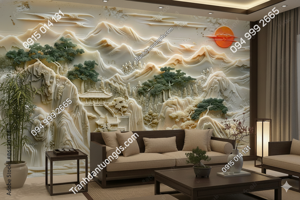 - Tạo Chiều Sâu và Độ Mở Cho Phòng Khách: Các mẫu tranh dán tường phong cảnh thủy mặc với núi non, sông nước, mây trời… có khả năng đánh lừa thị giác, làm cho phòng khách của bạn có cảm giác rộng rãi, thoáng đãng hơn rất nhiều.